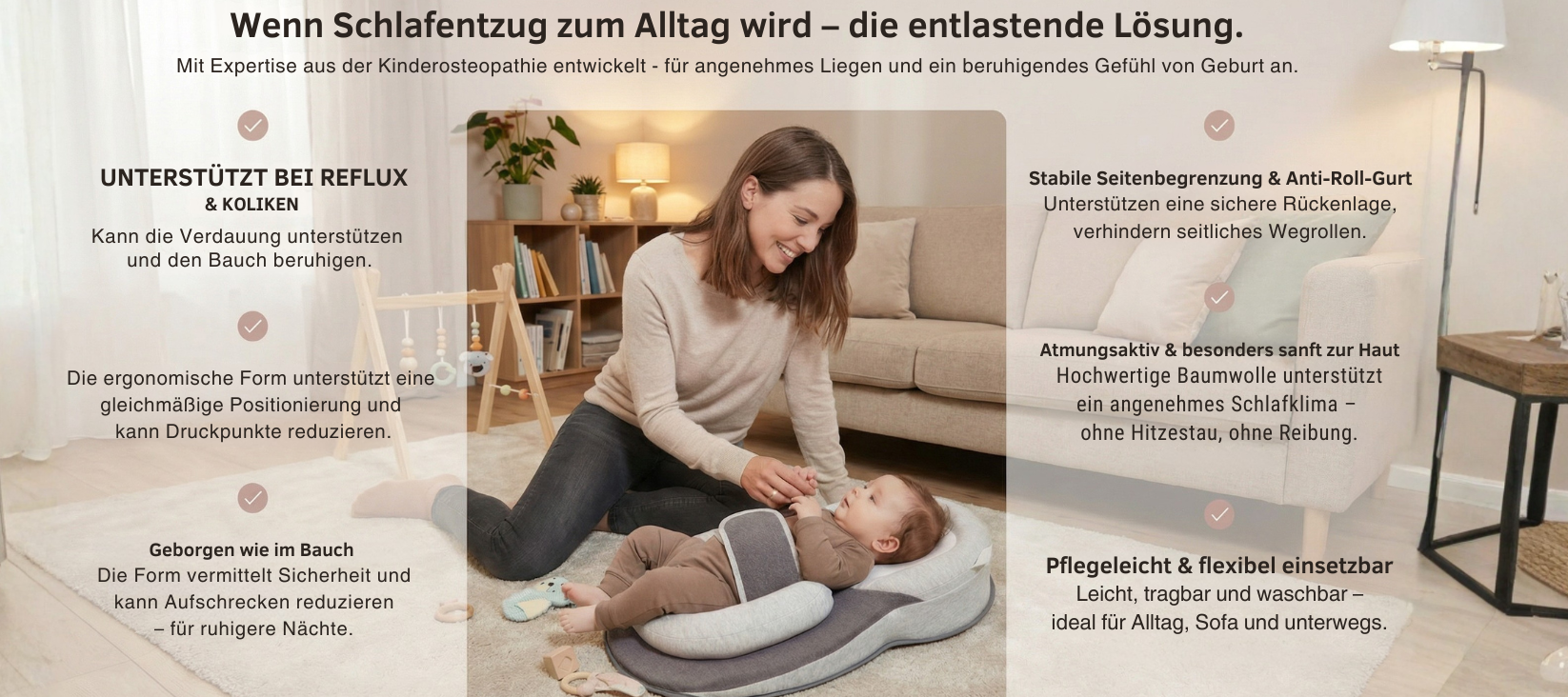 Viele Eltern berichten, dass ihr Baby durch die sanfte Begrenzung schneller zur Ruhe kommt. Die Form vermittelt Nähe und Geborgenheit.