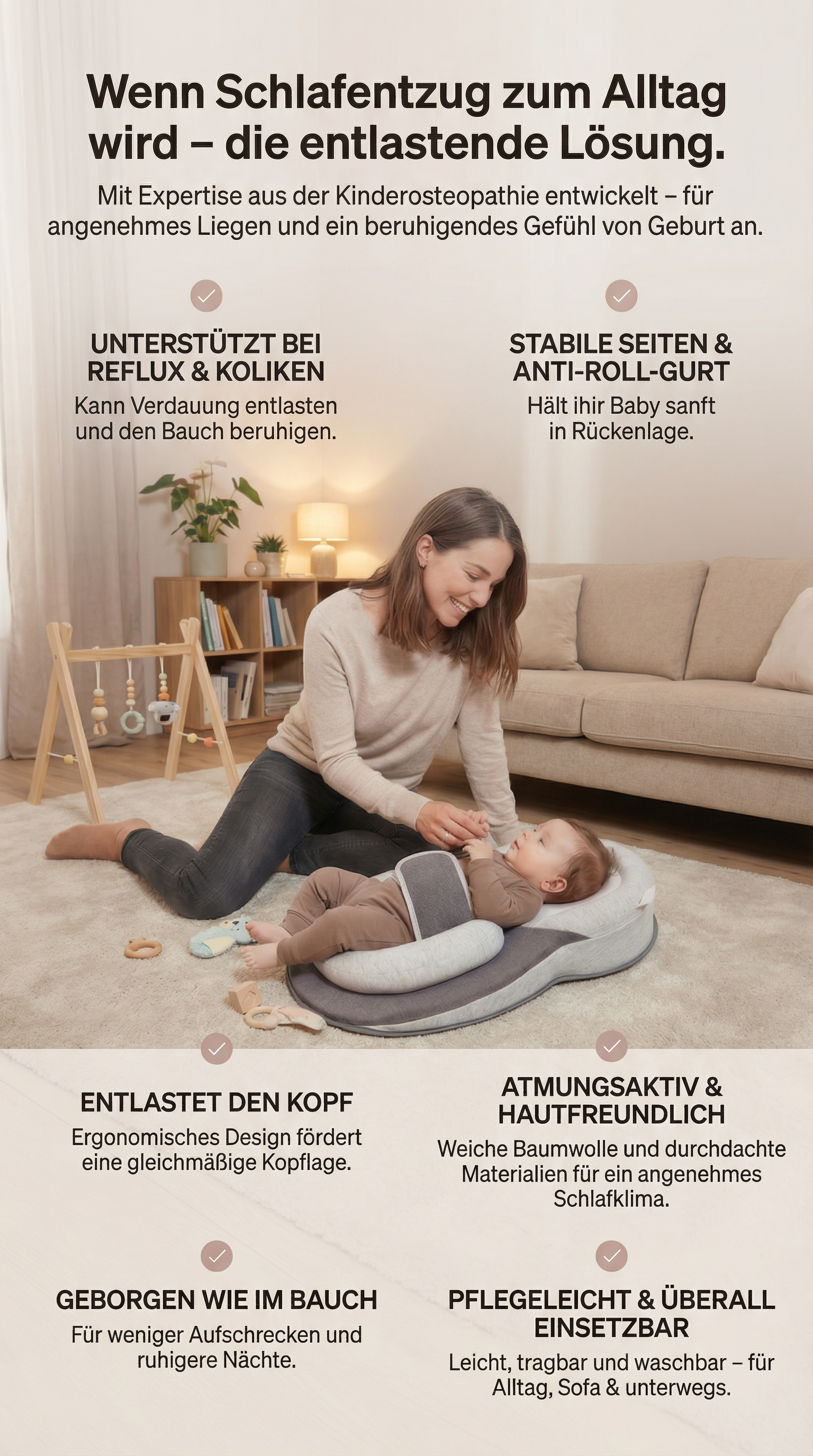 Die leicht erhöhte Position kann bei Husten, Spucken oder einem unruhigen Bauch entlastend wirken. NestNap ist jedoch kein medizinisches Produkt und ersetzt keine ärztliche Beratung.